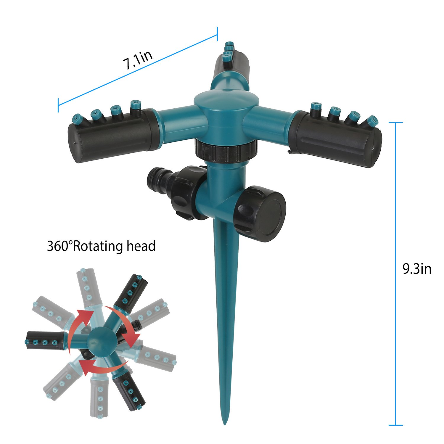 *Automatic 360 Rotation*:This three-arm sprinkler will rotate automatically when water goes through it. The 360 rotatable arms can be adjusted freely to change the spraying range; more flexible and convenient.