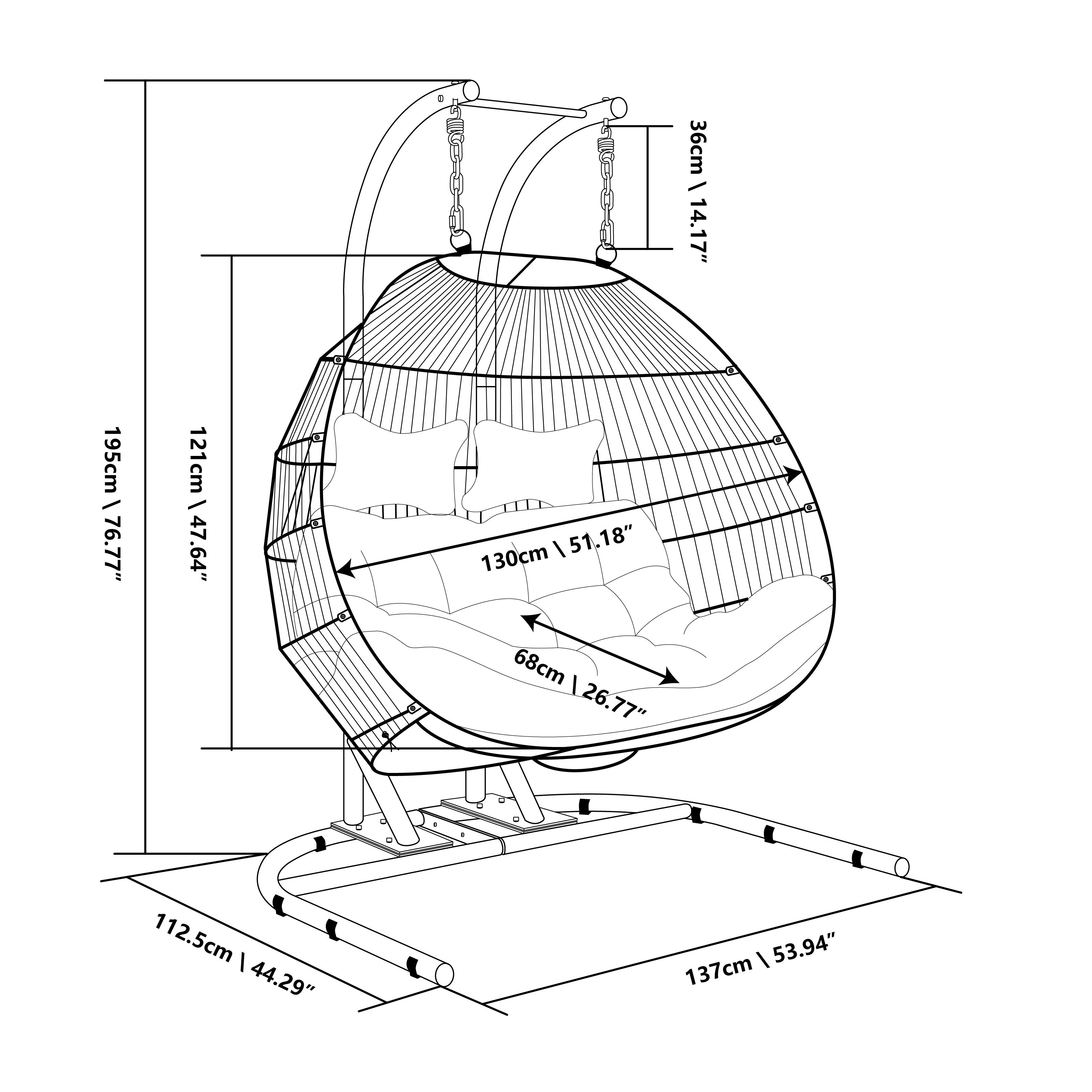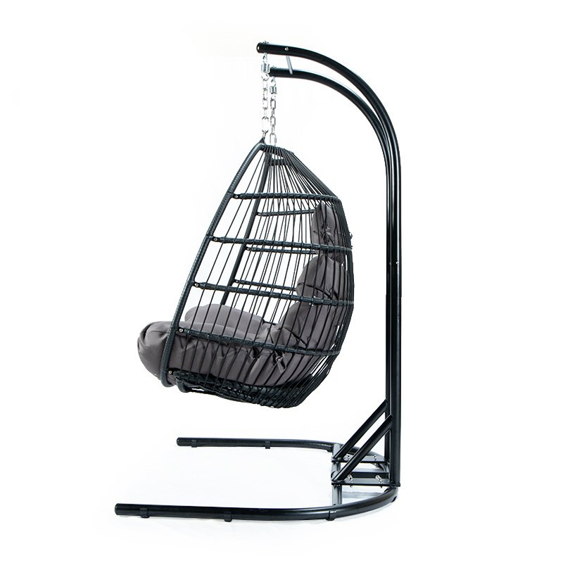 This fun egg-shaped porch swing chair has a folding feature for easy storage. The Egg chair was built to last in the outdoors with its strong durable iron frame it will be perfect for all weathers. This unique swinging Chair is the perfect addition to any space outside; a backyard patio; deck; in a sun-room or garden; or near a pool; or outdoor Bar.