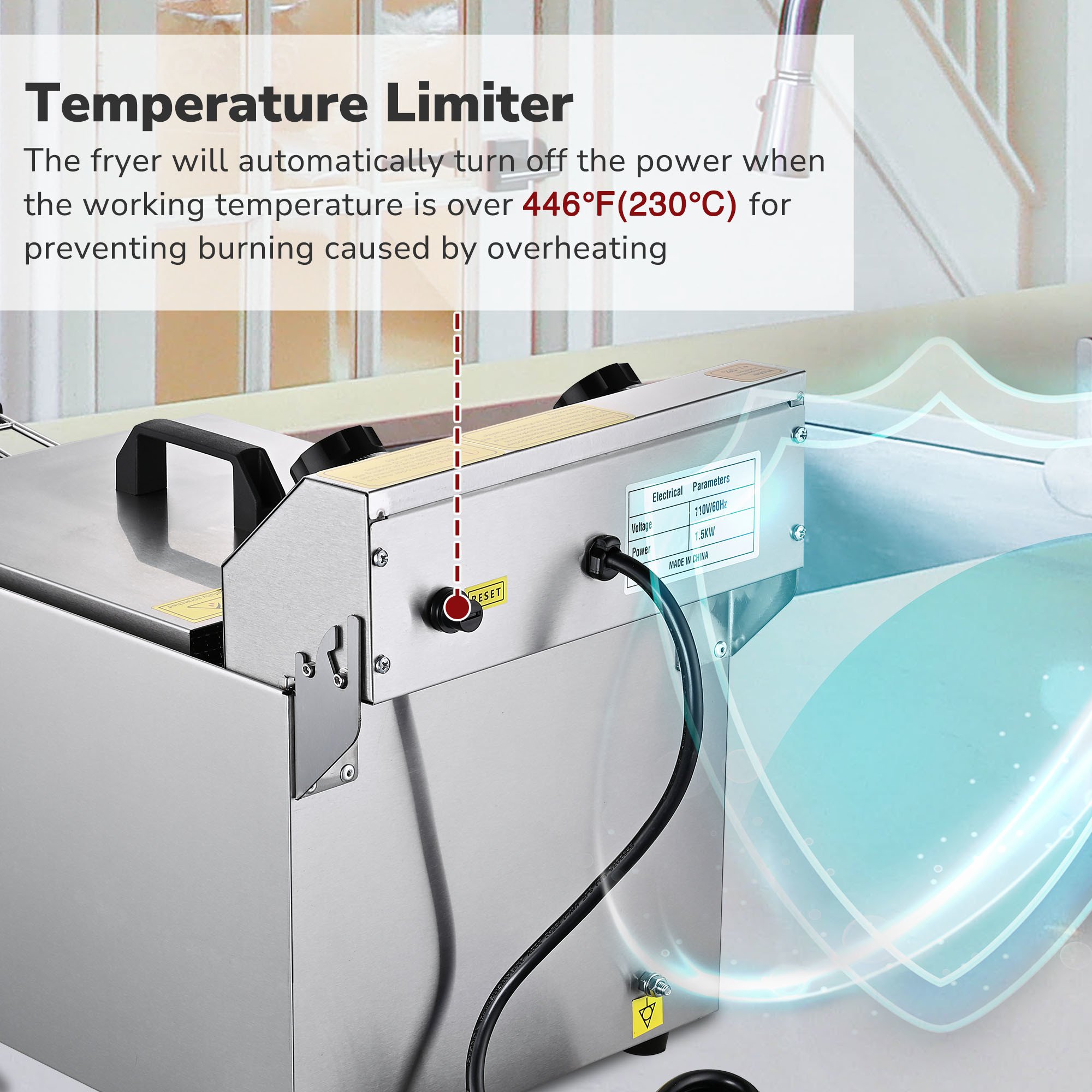 - Safe & Durable - Features overheating protection which automatically cuts off the power for at least 30 minutes when the temperature reaches to 464 degrees Fahrenheit; in order to prevent damage or injury from overheating; With a durable & anti-rust stainless steel frying basket; along with a UL-certified cable for safety and quality assurance