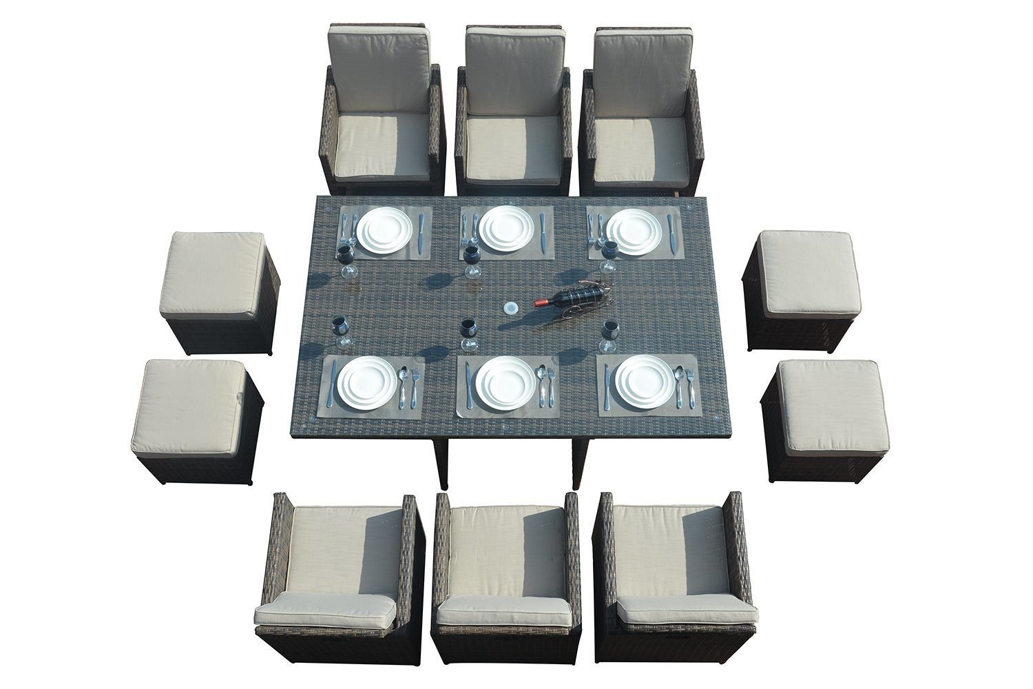 Get the outdoor seating you need with our Direct Wicker Complete 10 Seater Rattan Set. Including 6 chairs; 4 foot stools and a center table; this outdoor furniture set is the perfect option for those that need plenty of seating for casual usage or entertaining outdoors. Crafted with high quality woven water resistant rattan; this set is suitable for varying weather conditions all year round. Modern geometric chairs with matching stools provide complete relaxation for yourself and guests; allowing you to comfortably lounge while outside. With a specialized table base design structure; the furniture pieces seamlessly fit together; allowing for excellent coverage and shielding from the elements when left outdoors for prolonged periods of time. A thick sheet of tempered glass lays across the center table; providing easy cleanup and an ideal surface for entertaining with food and drinks.